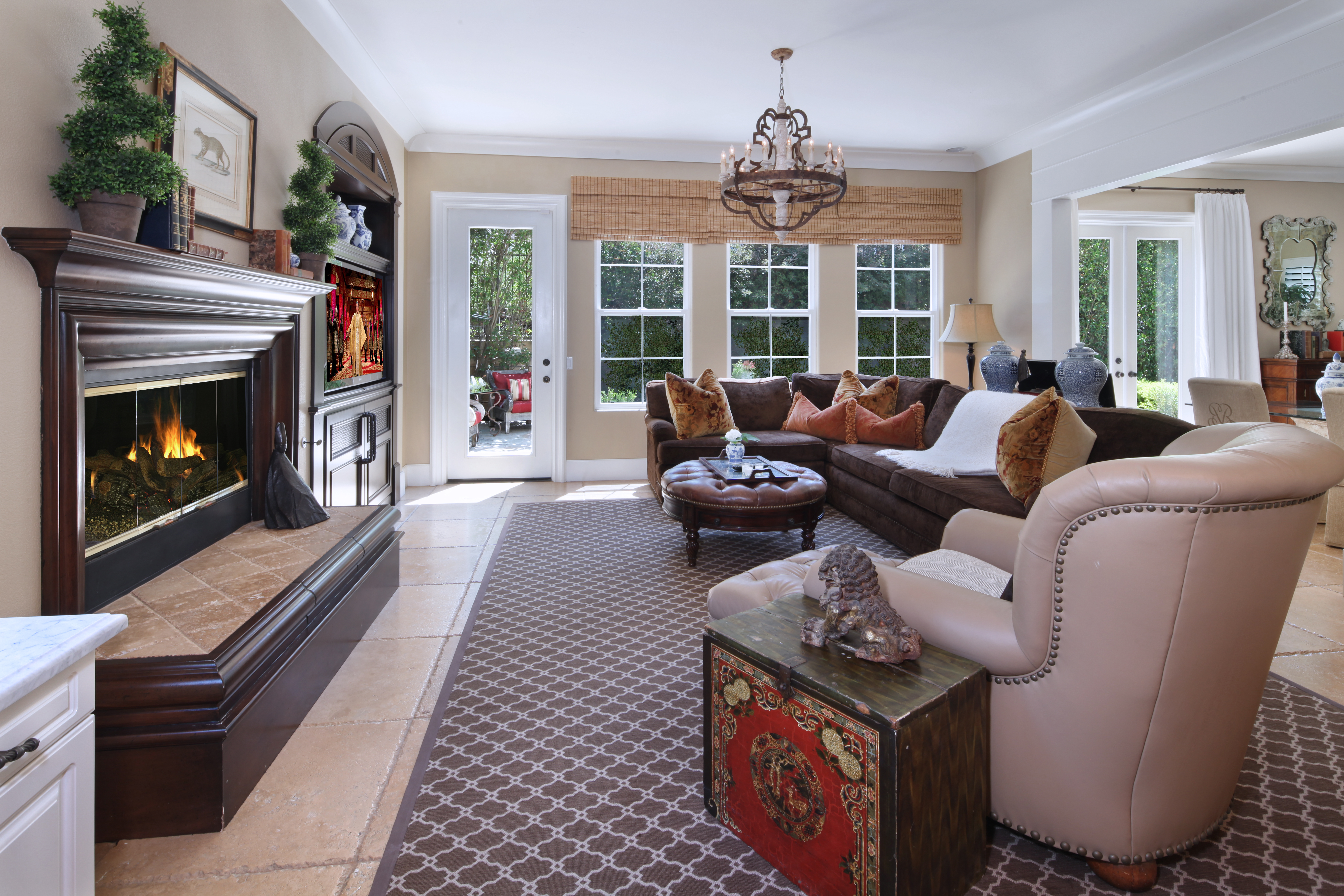 Расположение представленной здесь мебели несколько необычно. Студия О. представляла гостиную как уютную зону развлечений, способную разместить большие группы в удобной, непринужденной и элегантной атмосфере. Камин встроен в перегородку, им можно наслаждаться из обеденной зоны.