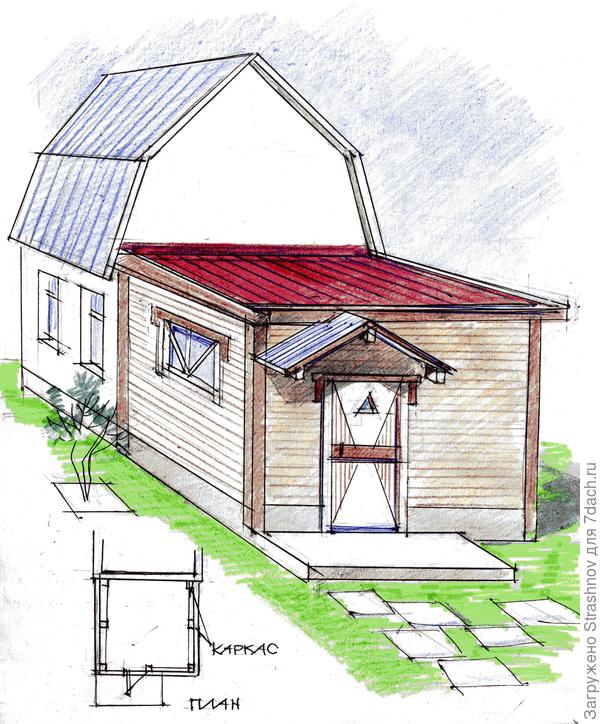 ) От существующей стены сарая можно отступить только в сторону уменьшения (для спокойствия соседей) Нужно утеплить пристройку к дому (сарай — стены, крыша + эркер — крыша).