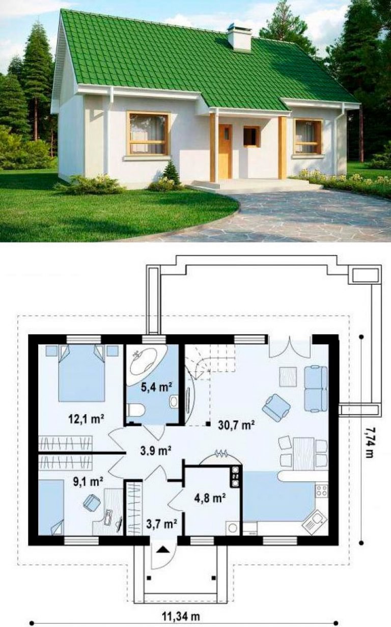 Это дом площадью 61 м2 с просторной гостиной, кухней, ванной, двумя спальнями и кладовой. Он идеально подходит для семьи из трех человек или же может использоваться в качестве уютного загородного дома, так как совмещает в себе столь важные качества, как экономичность и комфорт.
