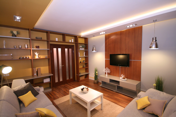 Рекомендуется использовать разные типы подсветки. Например, для зоны отдыха подойдут торшеры или бра. Но имейте в виду, что ставить бра напротив телевизора не рекомендуется, так как на его экране будут отражаться блики.
