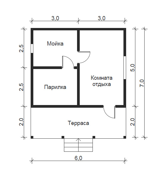 Планировка сауны с мойкой и террасой