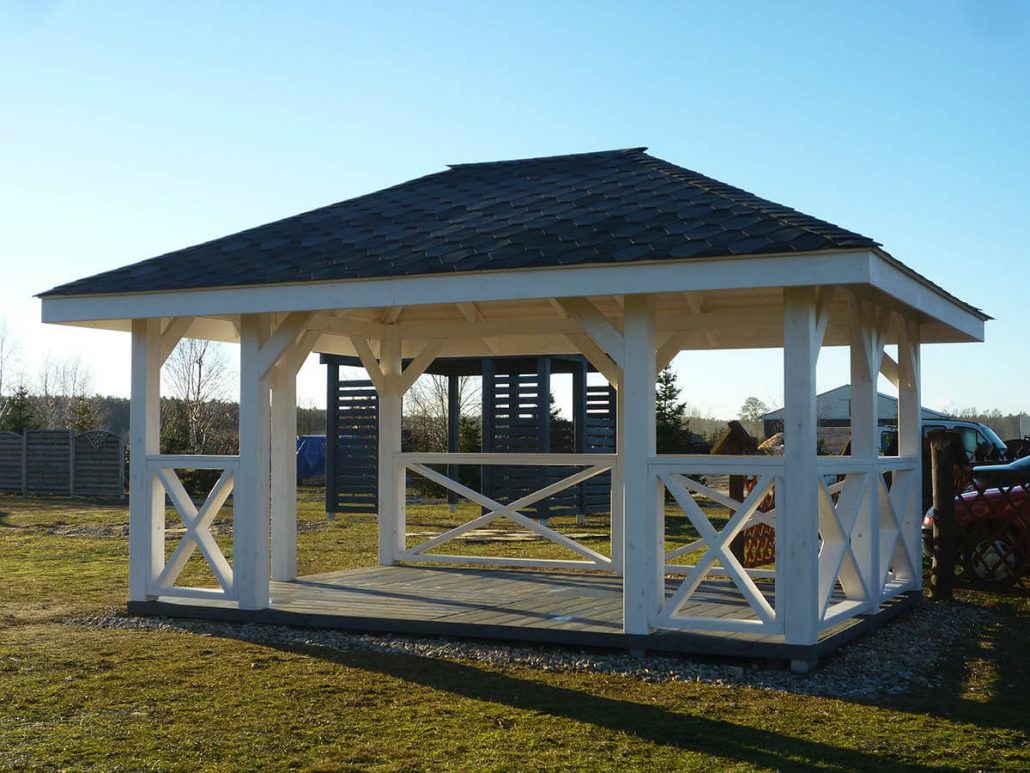 Для пола лучше всего использовать строганую доску толщиной 40 мм, и, как вариант, можно остановиться на 30 мм, но в таком случае между лагами должно быть не более 40 см расстояния. Дощатый пол обязательно нужно красить, так как в открытую беседку в любом случае будут попадать атмосферные осадки, а это вызывает гниение древесины. Но лучше всего для пола использовать террасную доску – это смесь пластика с опилками – выглядит, как натуральное дерево, но при этом нейтральна к намоканию, хотя на такой материал, безусловно, придётся раскошелиться.