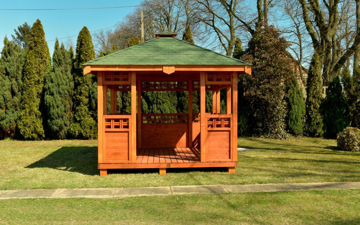 Каркас большинства беседок выполняют из дерева. Данный материал является экологически чистым, безопасным для здоровья.