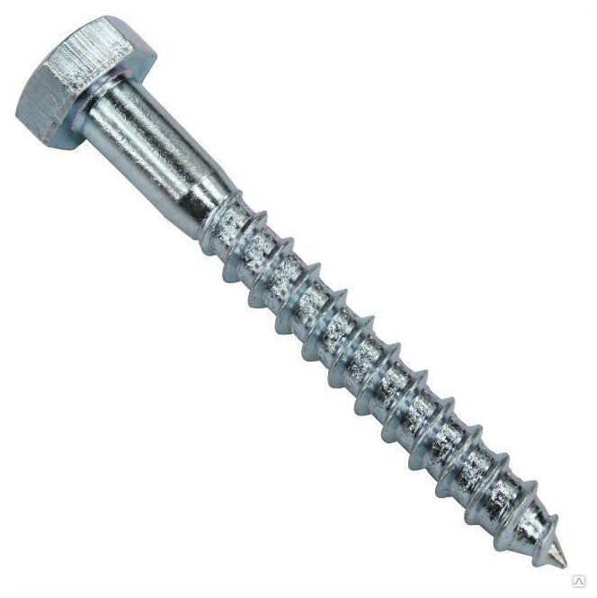 Для крепления деталей к деревянному основанию применяются глухари (шурупы с шестигранной головкой), изготовленные по DIN 571 (ГОСТ 11473-75). Изготавливают их из оцинкованной конструкционной углеродистой качественной стали 08кп, 10кп, 1022, а также из нержавеющей стали марок А2 и А4, диаметром от 6 до 20 мм. На фото — болт-шуруп из нержавеющей стали А2: