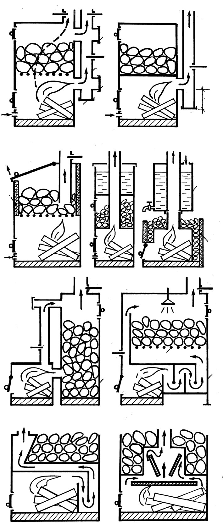 Если изучить многочисленные чертежи банных печей из металла, можно прийти к выводу, что с конструктивной точки зрения выделяют несколько разновидностей банных печей: