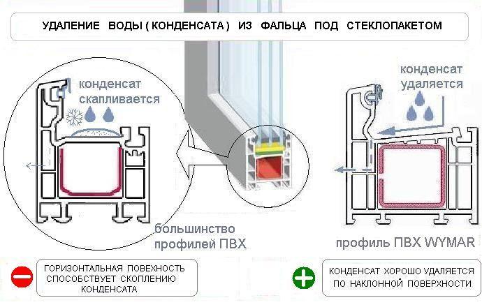 Причина первая — засорились дренажные отверстия. Если внимательно посмотреть на металлопластиковый профиль, то внизу на его наружной части можно увидеть небольшие отверстия. Они предназначены для выведения влаги, которая обычно стекает по внешней стороне стекол. Если дренажные отверстия засорились, то собранная влага вытекает из-под створки. В результате возле стеклопакета — повышенная влажность, из-за чего образуется конденсат.