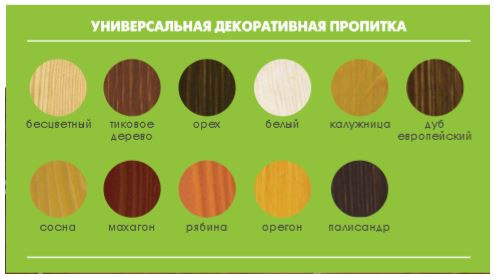 Продукт, выпускаемый в Словении. Несколько специфичен по запаху, но высокоэффективен и безопасен. Впитывается в дерево, не оставляя на поверхности пленки, максимально сохраняя «дышащие» свойства натурального материала. В линейке антисептика 17 различных цветов.