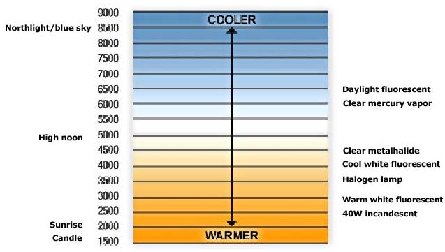 По мере того, как мы поднимаемся выше по шкале Кельвина, мы переходим к желтому, белому и синему цветам. Лампы накаливания и галогенные лампы находятся в пределах 2500K – 3000K. Прямой солнечный свет имеет эквивалент 4800K. Дневной свет обычно находится около 5600K . Облачное небо или холодный белый цвет можно найти между 6000K-7500K. Чистое голубое небо можно найти при температуре 10 000 К.
