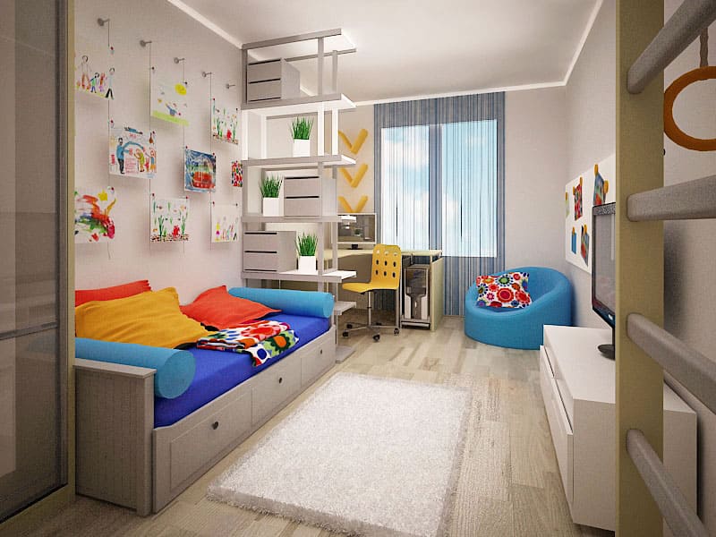 Мебель стоит расставить по краям комнаты. На одной стороне нужно поместить спальное место, а на другой – небольшой стол для занятий творчеством. Зону для игр можно организовать у стены рядом с дверью.