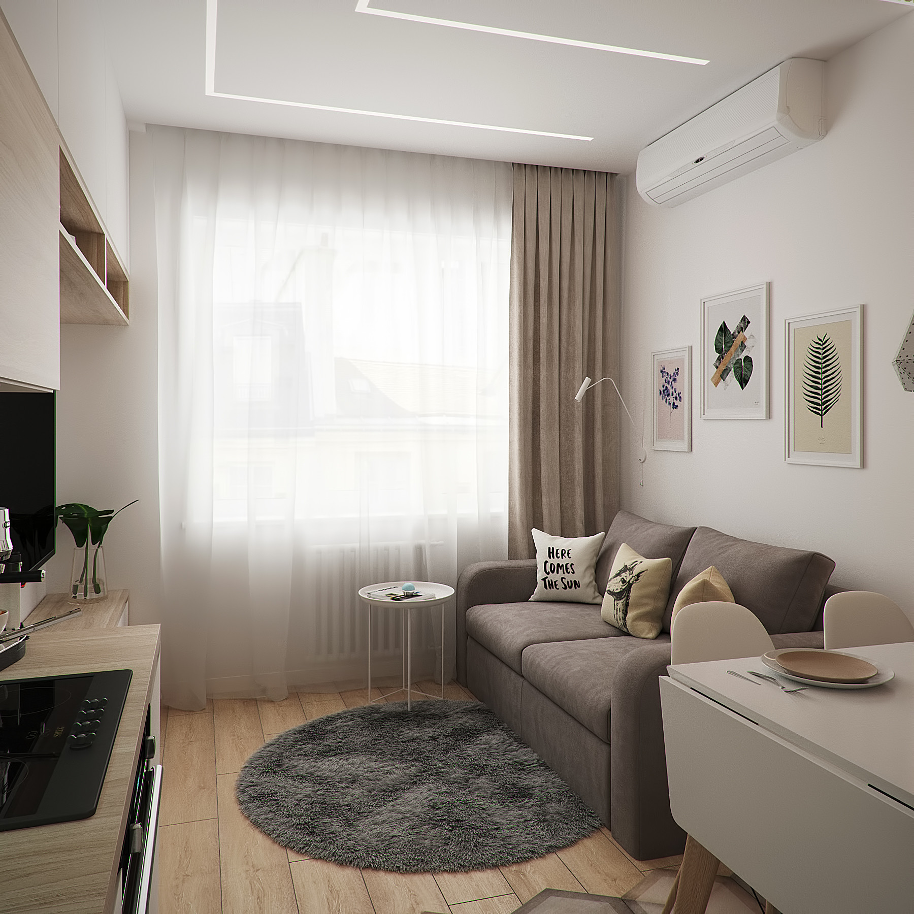 В гостиной скромного размера оптимально будет отказаться от громоздкой мебели.