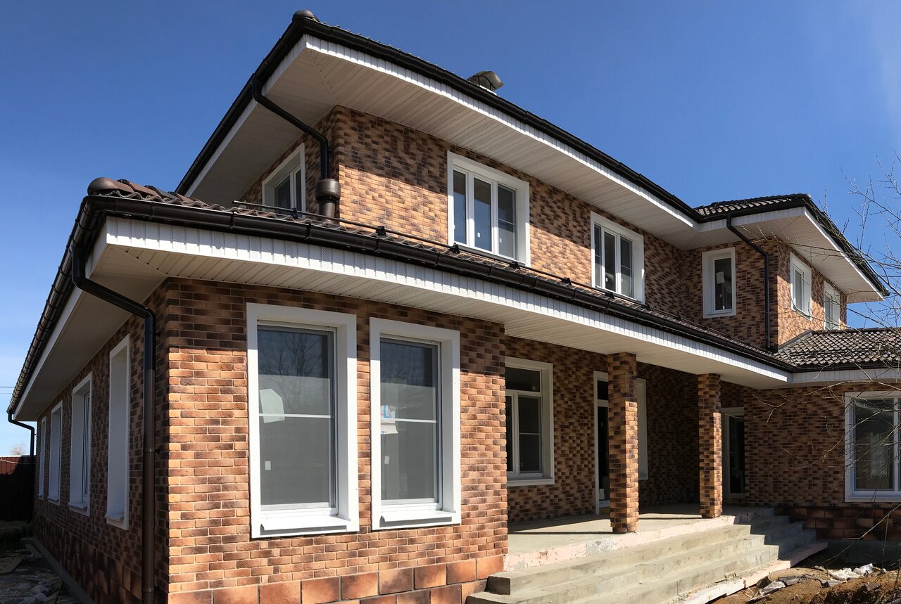 Однако современные технологии позволяют создавать более тонкие, дешевые, но при этом прочные и теплые стены — за счет применения многослойных конструкций из разных элементов. Это значит, что фасад кирпичного дома может демонстрировать, например, очень эффектную и реалистичную отделку под дерево.