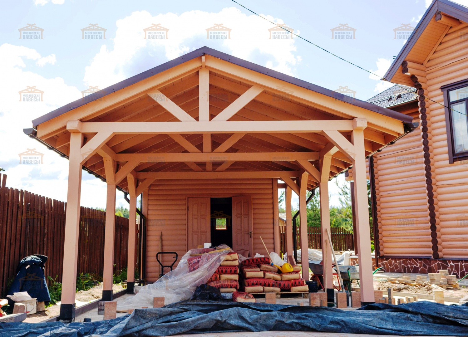 - кровля навеса из профилированных труб одной стороной закреплена на крыше хозблока, второй – удерживается опорами;