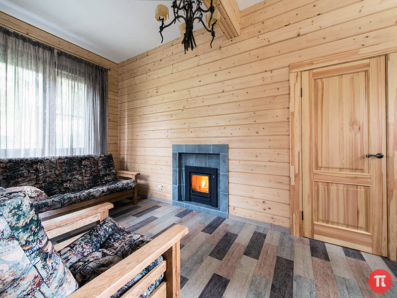 Камень, керамогранит, изразцы и майолика — все эти материалы годятся для создания акцентных пятен в деревянном интерьере.