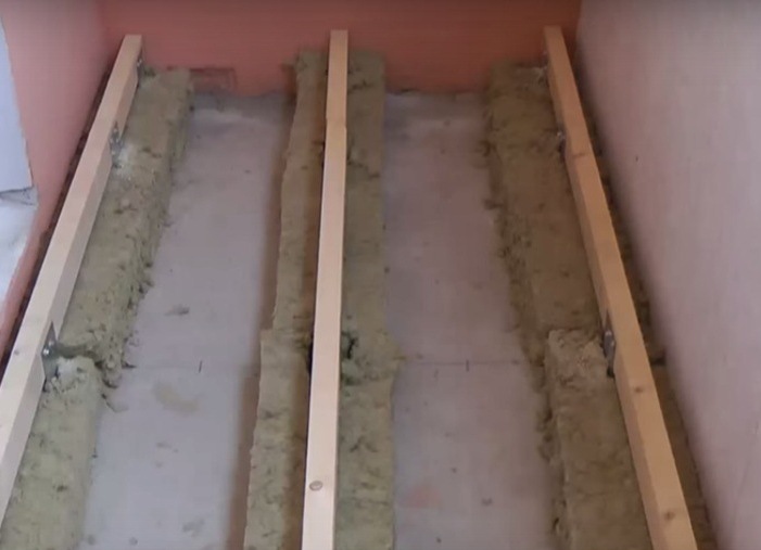 Лаги основного слоя располагаются вдоль балкона, расстояние между ними — 45-50 см, от стен — около 3-5 см.