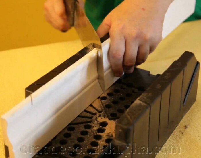 Как отрезать потолочный плинтус с помощью стусла – внешний угол: