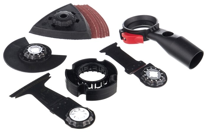 Хотя модель продается по невысокой стоимости, в комплекте есть дельташлифпластина, две пильные насадки, различные ограничители глубины, а также кейс.
