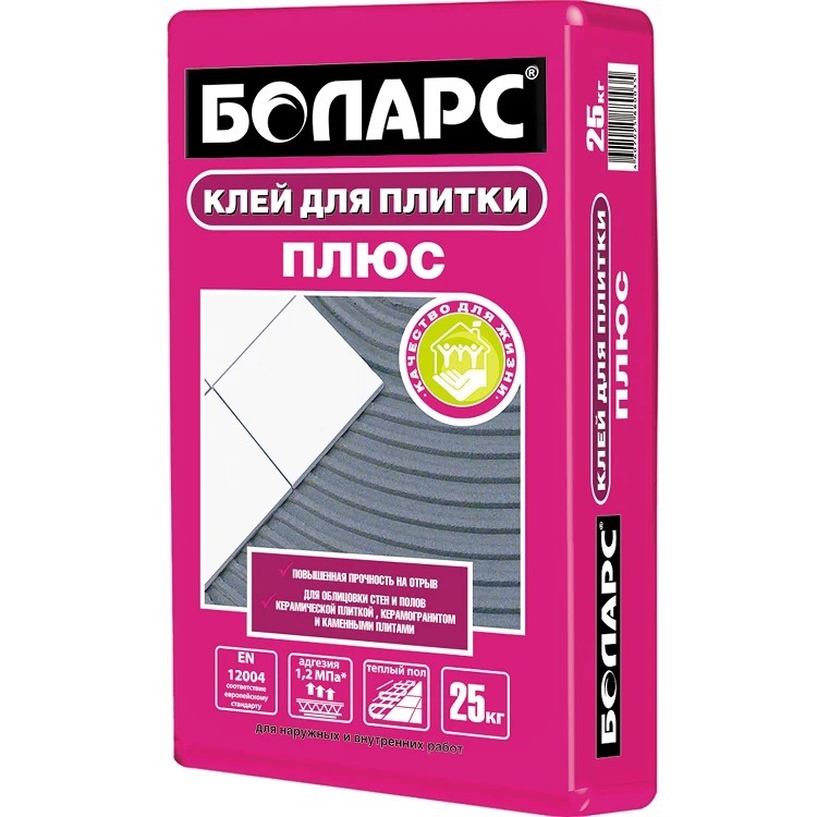 Смесь сухая строительная клеевая С1, ГОСТ Р 56387. Изготовлена на основе цементного вяжущего, минеральных наполнителей, фракционированного песка и модифицирующих добавок, улучшающих эксплуатационные свойства. Для внутренних и наружных работ.