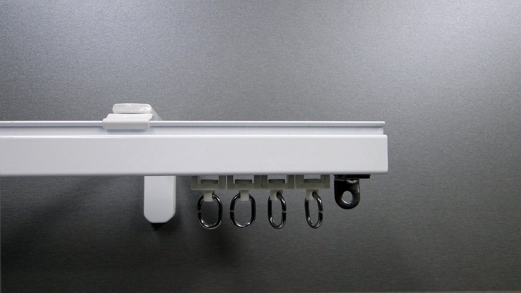 - жесткий карниз с одним внутренним рельсом – состоит из однорядной рейки, а также защелки для крепления к кронштейнам. Для создания добавочных рядов подобные карнизы укомплектовываются декоративными моделями;