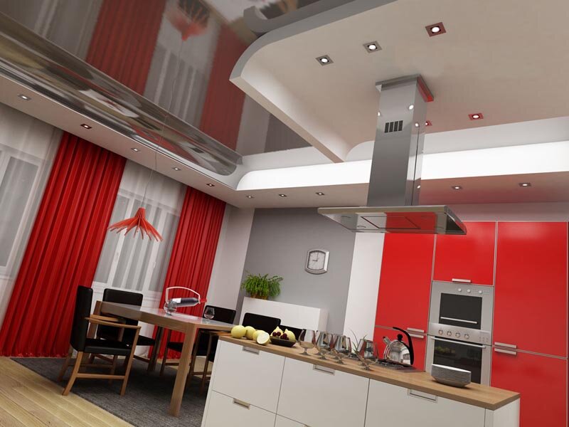 Натяжные потолки без проблем удовлетворят даже самую интересный дизайн потолка на кухне, чему способствует их разнообразие, а также легкость используемых материалов.