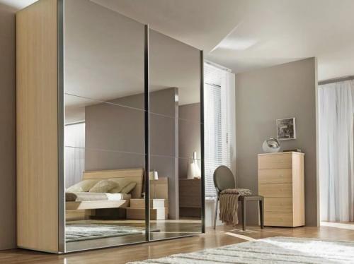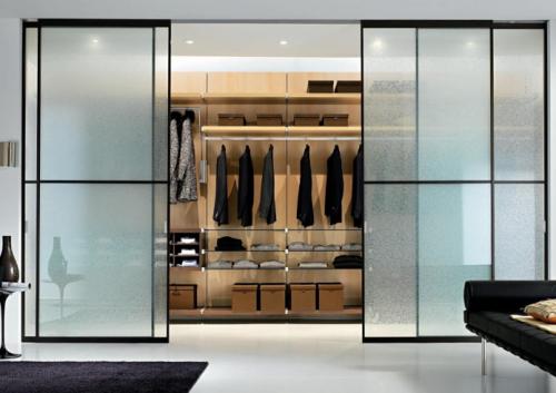 Для размещения элементов наполнения гардероба используют межкомнатное пространство, заменяют одну дверь раздвижной конструкцией. Стекло изнутри тонируют – покрывают отражающей пленкой, шкафы делают закрытыми, или закрывают полки римской шторой, чтобы вещи не выгорали, обувь не ссыхалась на солнце.