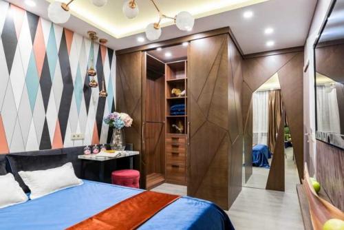 Обустройство гардеробной в спальне нестандартной формы позволит сбалансировать геометрию помещения.