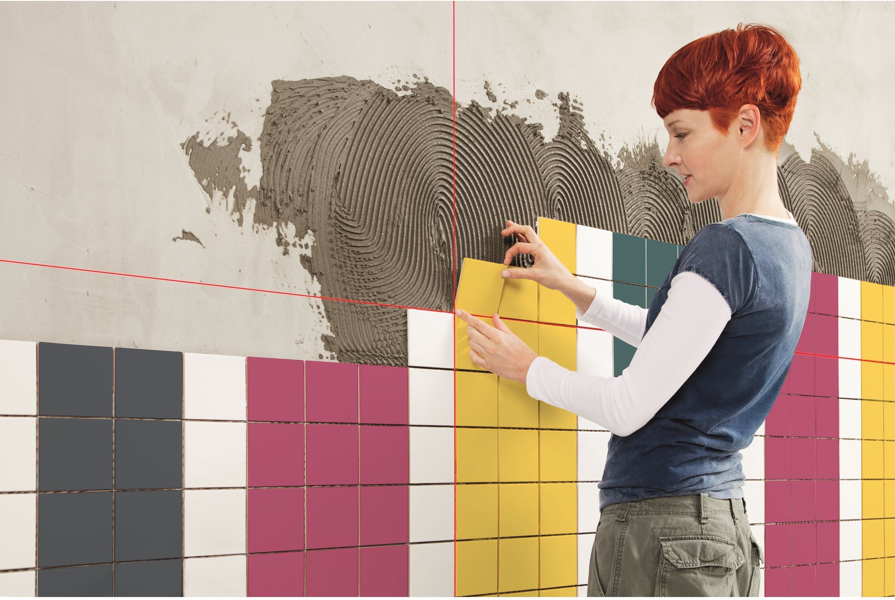 Сделайте так, чтобы линии пересекались в центральной точке противоположных стен. Как только у вас получились идеальные квадратные линии, скорректируйте их. Теперь разложите плитки в обоих направлениях и оставьте места для равномерных швов, используя прокладки для плитки. Вы можете скорректировать линии в центре, прижав 1/2 плитки ближе к стенам.