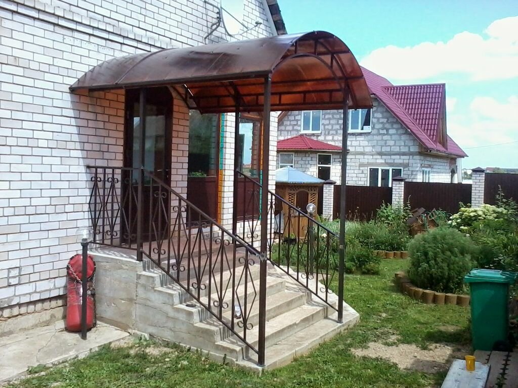 Коварные козырьки над крыльцом часто изготавливают в виде полусферы, но нередко крышу делают односкатной или двускатной.