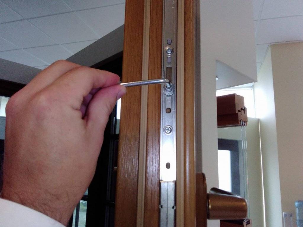 - если запорный механизм фурнитуры оснащен утопленным вариантом цапф, необходимо потянуть деталь на себя для корректировки положения;