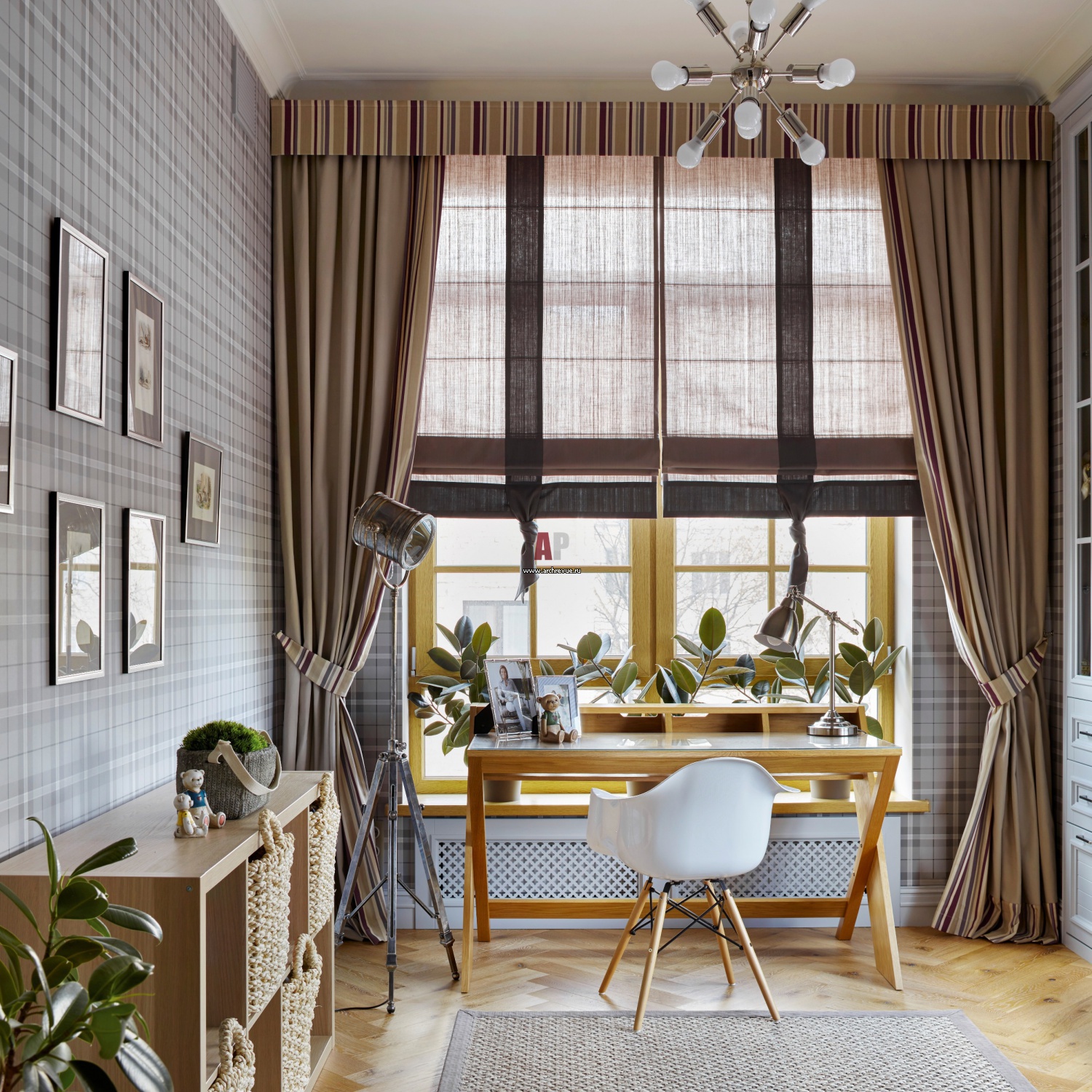 Также классическим вариантом является использование штор и тюля, прикрывающих одно окно. Такой способ оформления поможет регулировать освещение и при необходимости оставит достаточно света в помещении.