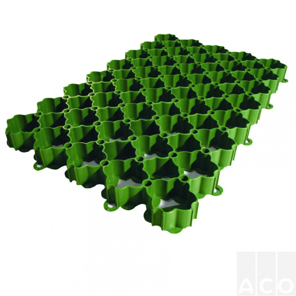 Газонная пластиковая решётка изготовлена из полимерных лент HDPE с высотой ребра 33, 40 и 50 мм и размером модуля 60×40 см при массе 1,47 кг. Цвет синтетика зелёный и чёрный, в 1 м² находится 4 модуля, а максимальная нагрузка составляет 2000 kH.