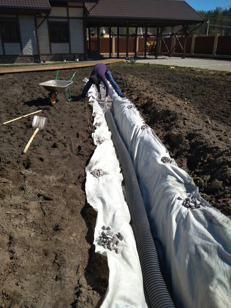 Далее траншея заполняется смесью щебня и песка, что создает водонесущий слой. Сверху дренаж засыпают грунтом и укладывают поверх него слой дерна.