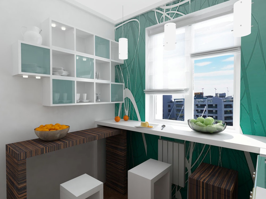 Очень эффектно выглядят кухни с окном в рабочей зоне. На месте бывшего подоконника делают столешницу, которая заменяет рабочую поверхность или служит местом для перекуса. Если она модифицируется в барную стойку, будет целесообразно убрать нижнюю полку, чтобы освободить место для ног для комфортного сидения. Вместо барных стульев лучше приобрести табуреты, которые легко задвигаются под столешницу и не занимают много места. Гарнитур может располагаться по бокам в виде буквы П. Такая кухня с рабочей зоной у окна должна быть квадратной формы, поскольку в продолговатом помещении проход будет достаточно узким. Расстояние между боковинами гарнитура должно быть не менее 1–1,2 метра. У окна на кухне также можно поставить мойку – тогда появится возможность любоваться видом из окна, не отрываясь от работы.