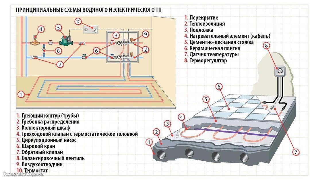 Конструкция системы такова, что непосредственно в полости между основанием и финишным покрытием расположен контур отопительной линии, по которой циркулирует жидкость. Это может быть как вода, так и антифриз.
