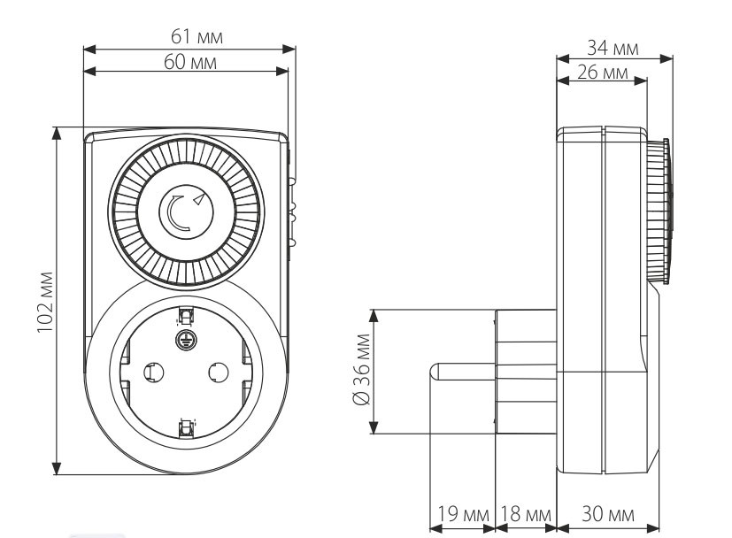 Как можно видеть на иллюстрации вверху, программируемая розетка имеет посадочное гнездо для подключения электрооборудования и штепсель (на задней поверхности), как упоминалось выше.