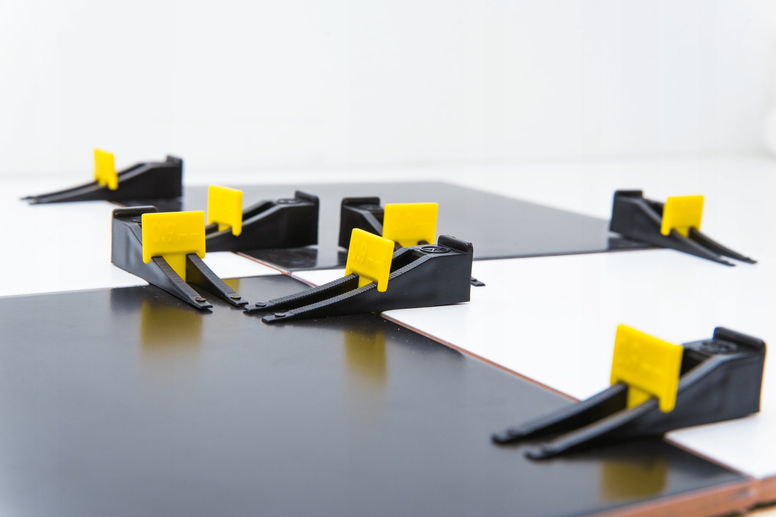 Система премиум-класса помимо большей стоимости отличается специфическим строением – основа межшовной вставки имеет выгнутую форму. Вначале это кажется недостатком и вызывает недоумение, чем же она лучше? Однако, несмотря на то что изначально основа смещает плитку, после её фиксации зажимом происходит самовыравнивание. Пластина выгибается на столько, сколько нужно для ровной укладки кафеля и распределения клея относительно существующих дефектов пола.