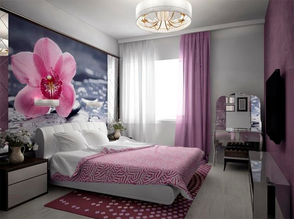 Прекрасно будут смотреться на стене в спальне фотообои с объемным изображение цветов, такое оформление комнаты наполнит ее романтикой и любовью. Классическим вариантом считаются орхидеи и розы, среди последних особенно популярны белые.