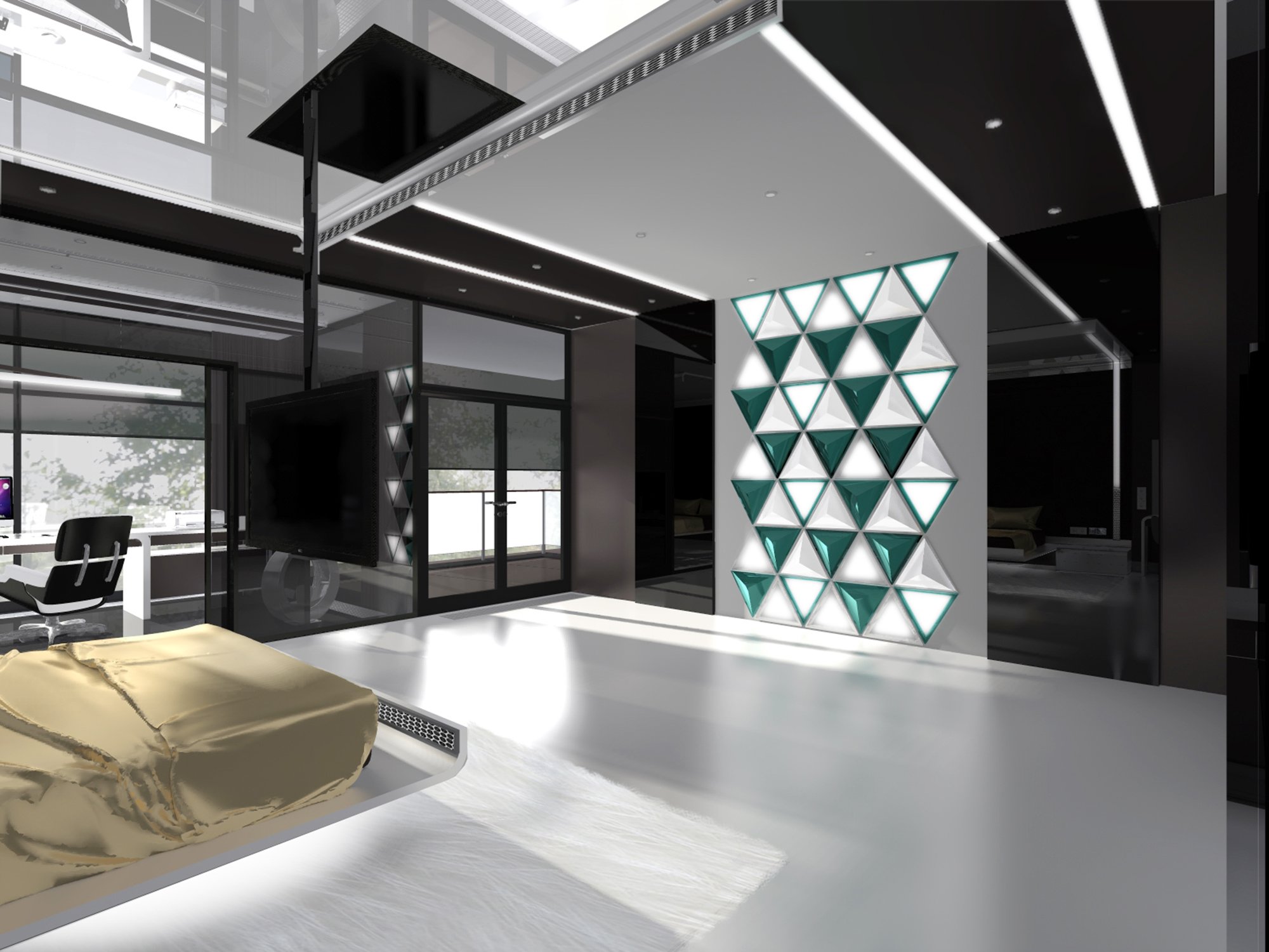 Футуристическая дизайнерская кровать идеально вписывается в этот интерьер