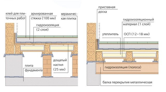 Схема укладки плитки на деревянный пол на лагахВсе щели, получившиеся на стыках досок, надо аккуратно запенить. После этого основание покрывается гидроматериалом, ГВЛ и выполняется укладка плитки на деревянный пол, как в первом случае, описанном выше.
