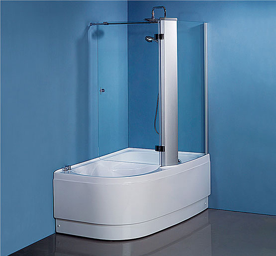 Если же размеры помещения небольшие, и клиент не может определиться, советуем универсальный вариант 2 в 1 — компактную ванну из акрила или искусственного камня со стеклянной душевой шторкой, которая может закрывать пространство над ванной частично или полностью.