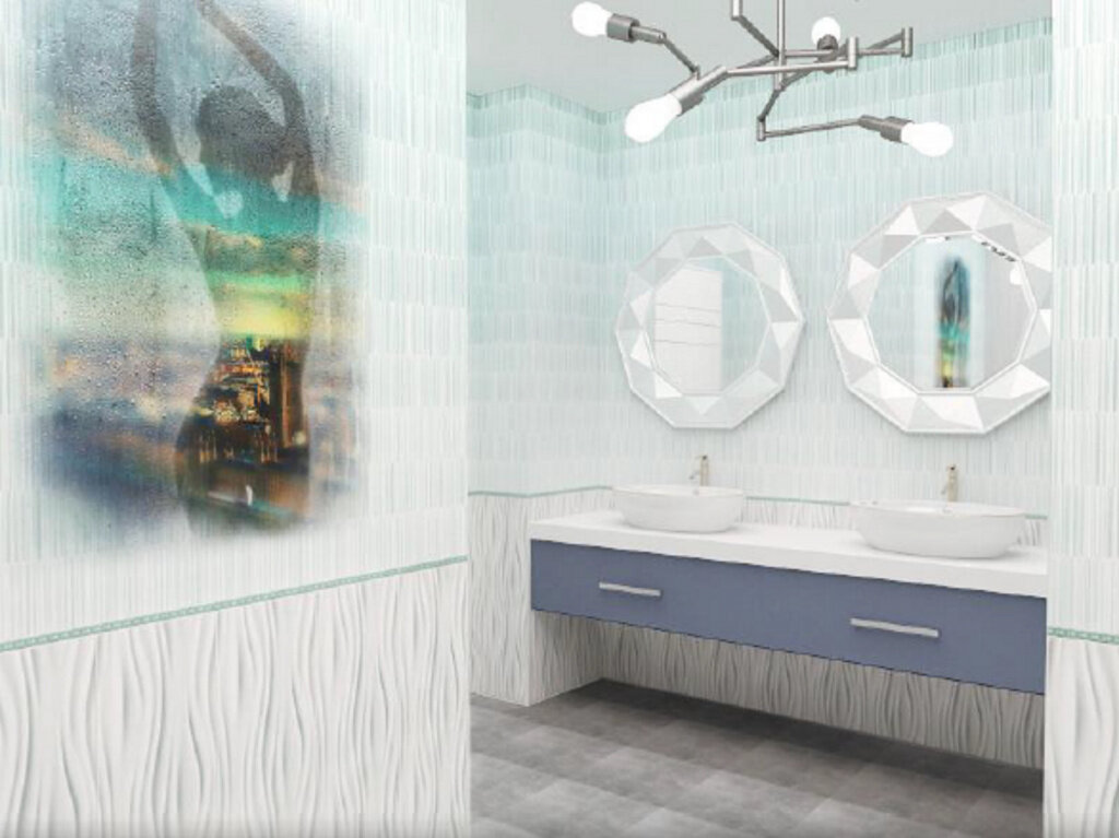 Скажем, вокруг зеркала или в душевой зоне оформляется панно с рисунком, а остальная часть помещения делается одноцветной.