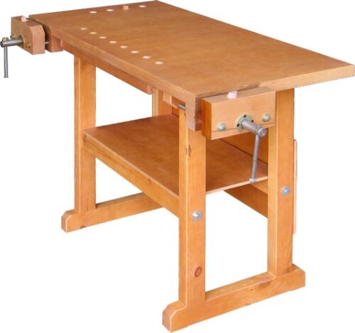 Этот верстак выглядит и ощущается солидным, потому что он действительно прочный. Он включает в себя передние и концевые тиски, а также отверстие для упора на скамье и на тисках.