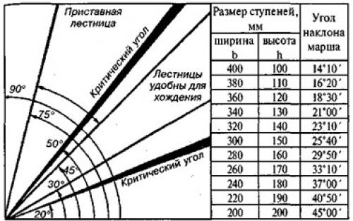 Опыт многочисленных проектов в частных домах показывает, что оптимальный уклон лестничного марша 27-38 градусов. В таких условиях удобно и безопасно не только подниматься и спускаться, но и поднимать крупногабаритные предметы.