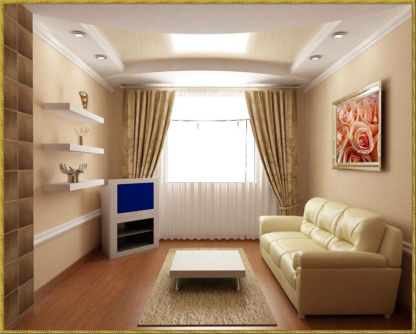 - Для маленькой гостиной в квартирах, типа хрущевка, подойдут одноуровневые конструкции или многоуровневые модели с частичным расположением по потолочной поверхности.