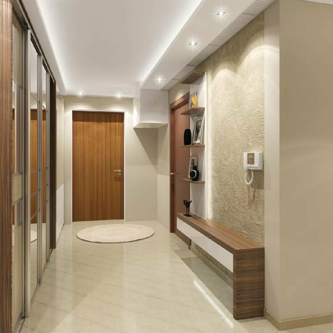 Главная проблема узкого коридора заключается в том, что в нем сложно поместить мебель, если есть такая необходимость. Кроме того, владельцам длинных коридоров нужно позаботиться о сглаживании разницы в размерах стен. Решить эту проблему можно с помощью зонирования, поделив помещение на места для обуви и одежды, а также отдельно выделив холл. Делается это с помощью многоуровневых потолков или комбинированного покрытия стен и пола.