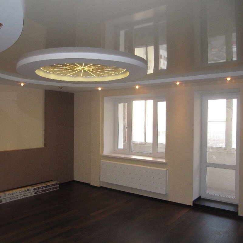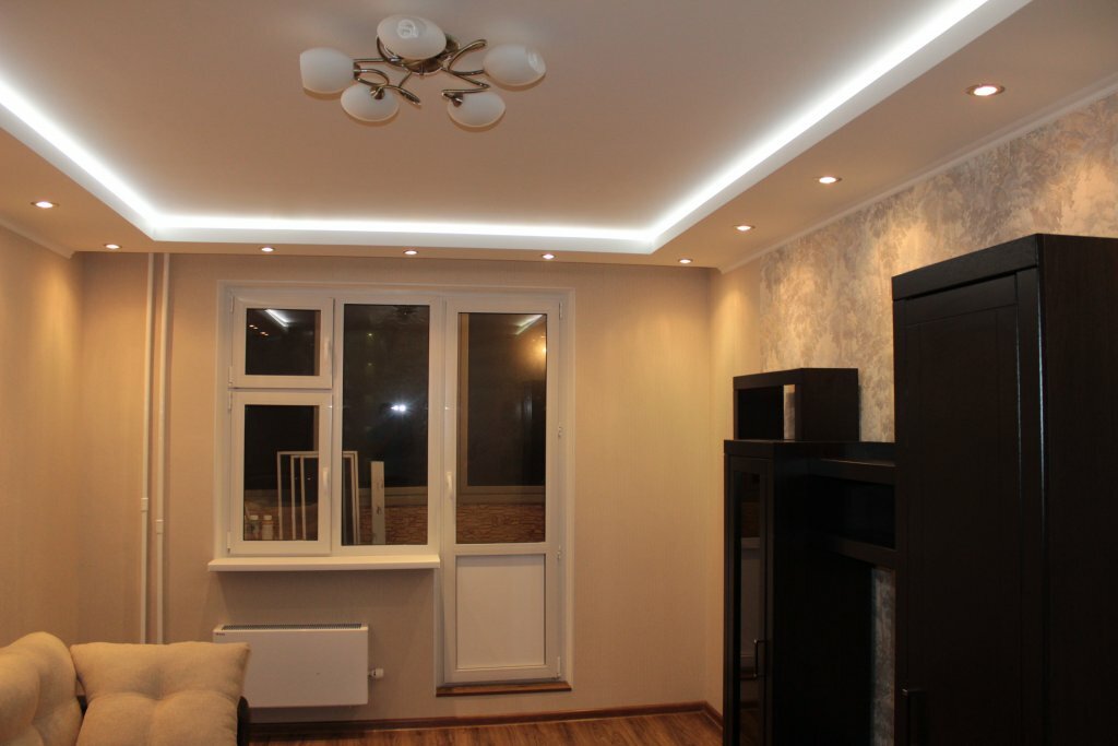 В конструкцию устанавливаются точечные светильники, но их размещение необходимо продумать заранее, до начала ремонтных работ. Также можно сделать подсветку с помощью светодиодной ленты. В многоуровневых конструкциях часто используется несколько вариантов освещения. - Для натяжных потолков уместны люстра или точечные светильники. Но необходимо помнить, что материал может деформироваться при нагревании. Поэтому места для установки осветительных приборов продумываются заранее. Оптимальным вариантом считаются светодиодные лампы, которые не нагревают пленку или ткань, исключая ее деформацию.