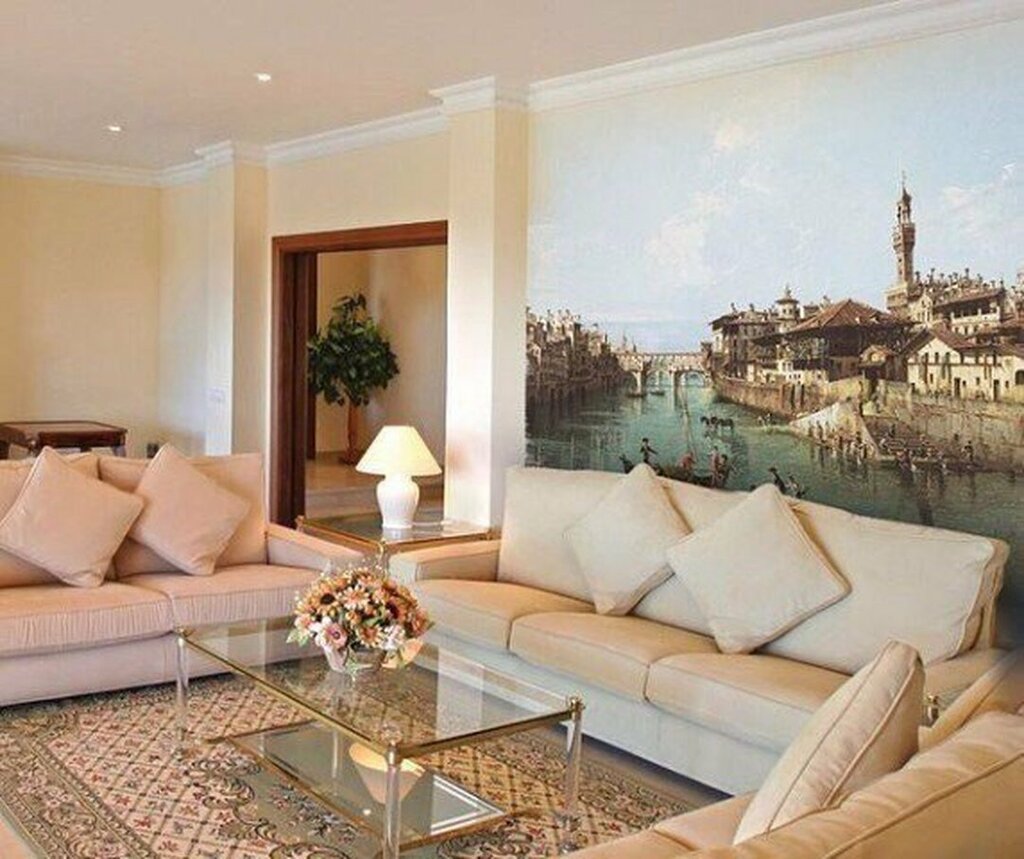 Фотообои, имитирующие фактуру. Фотообои, имитирующие мозаику, живопись и фрески органично впишутся в гостиную классического дизайна. Данный вид обоев сморится роскошно и благородно, однако подходят только просторным гостиным, у которых высокие потолки.