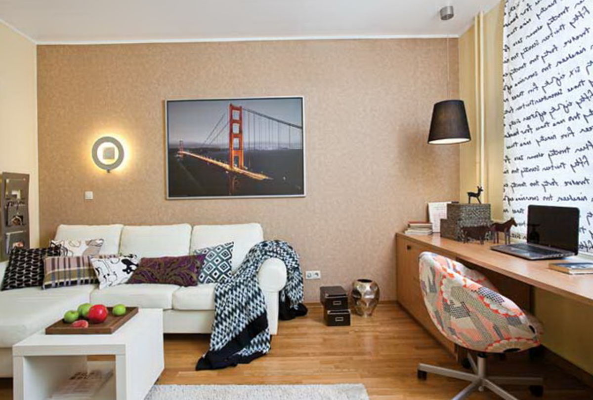 Для небольших комнат главным ключом в хорошем дизайне являются светлые оттенки. Легкие и воздушные, они создают особое очарование чистоты и гостеприимства. Вы можете выбрать не только белые оттенки, но и бежевые, розовые, желтые. Подумайте и об акцентной стене (с яркими обоями или покрашенной в смелый цвет) для создания дополнительной глубины. Темная и крупная мягкая мебель поглощает свет и крадет ощущение простора, а светлая, наоборот, практически незаметна даже при больших габаритах. Подумайте и об использовании прозрачного стекла, блестящих и металлических предметов декора, экологических чистых материалов и яркого текстиля.