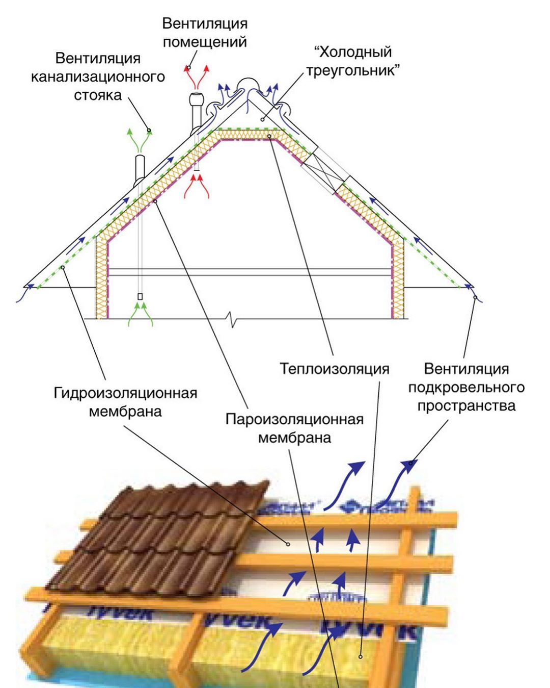 Подкровельное пространство под профнастилом должно хорошо вентилироваться.