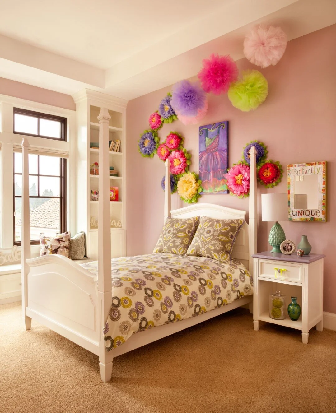 Теплый плед, мягкие подушки, светильники с необычными цветами сделают комнату уютнее. В такой спальне сразу захочется устроить пижамную вечеринку или посмотреть любимые сериал.