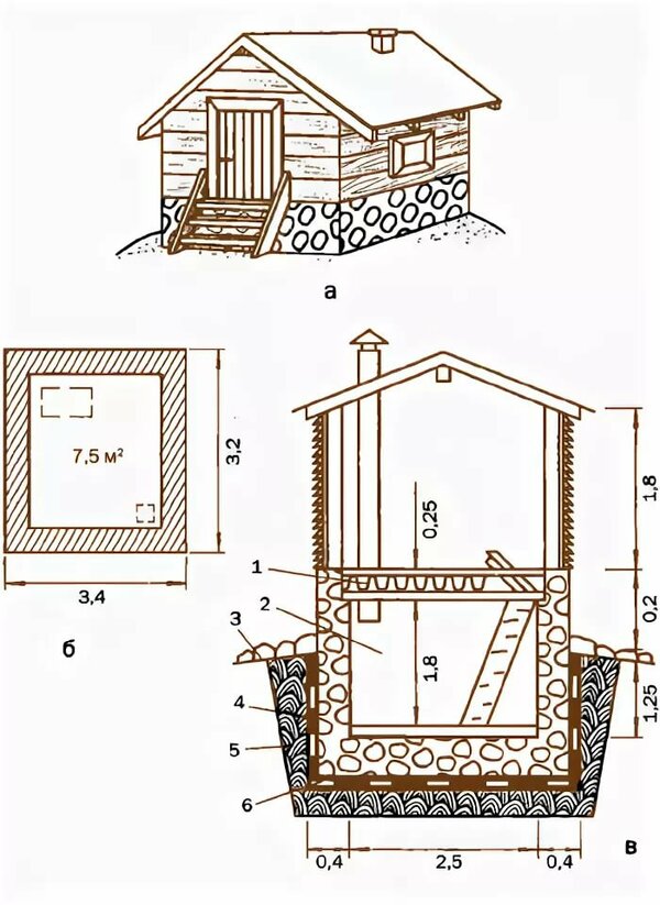 Его строят на самом возвышенном месте участка. Оптимальный размер подвала для небольшой семьи (4–5 человек) 2х2 м, глубина 2,5–3,0 м, могут быть сооружения большего размера, более глубокие — все зависит от потребностей строителя.